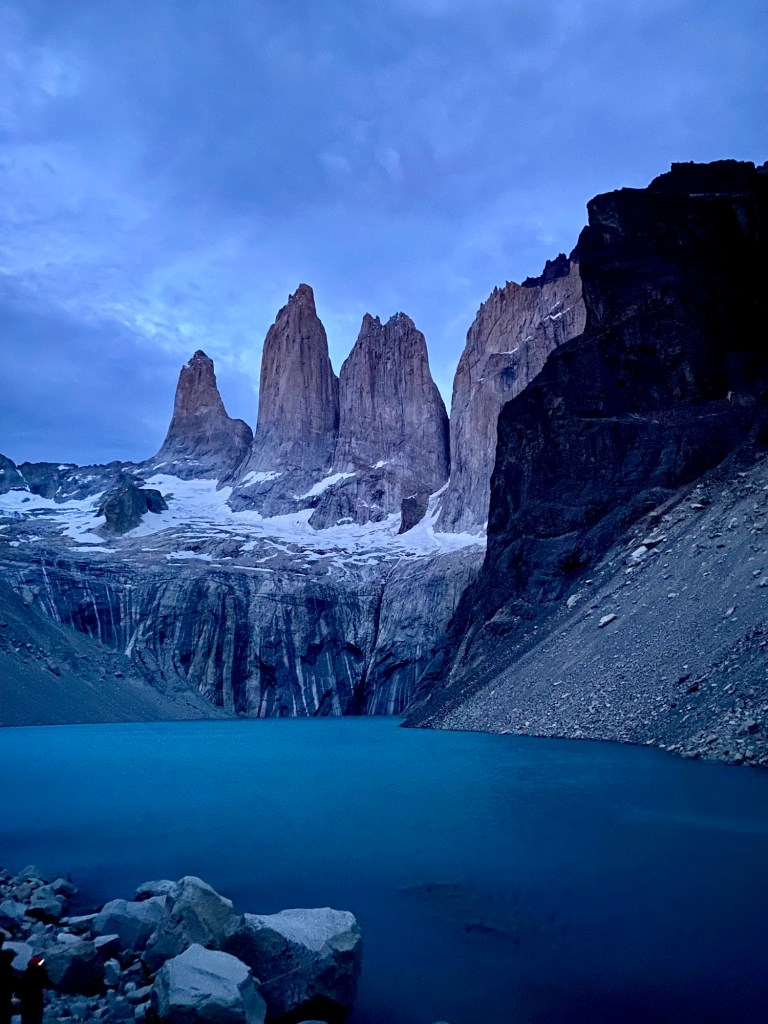 Without a queue of tourists we made easy effort over the rocky terrain. Once at the summit we were greeted with a moody version of the towers which stood dark and overbearing. The odd displacement of rocks on the ravine caused puffs of dust to appear like smoke hovering above the inky water.