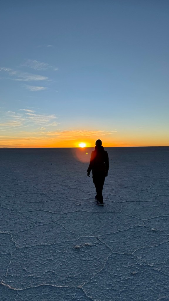 We were now standing on the salt flats admiring the suns ascent. A 360° view of blue sky meeting white salt. It looked like a pastel picture that stretched out indefinitely. Salar de Uyuni is the largest salt flat in the world and was once a high altitude prehistoric lake which, over time, evaporated resulting in a hexagonal-shaped salt crusted floor.