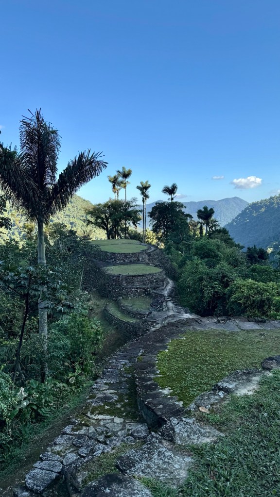 The steps ascended quickly away from the river and into the thick jungle. Before long we arrived at the the city, a vision of green with familiar stone tiered platforms under large palm trees, which you had to crane your neck to see the tops of. It was difficult not to compare the Lost City to Machu Picchu. Firstly, the architecture of both cities had been built to increase agricultural yields, and withstand earthquakes and mudslides. Therefore, both used stone terraces to achieve this and sloping the city downwards to avoid flooding. Secondly, the sun is a spiritual figure in both cultures with buildings designed in relation to the sun’s position in the sky. Finally, and perhaps the most obvious, was the location. Both were built high in the mountains in a hostile jungles close to naturally occurring water springs. I was surprised at how similar the cultures were despite being over 600 years and 4500km apart.