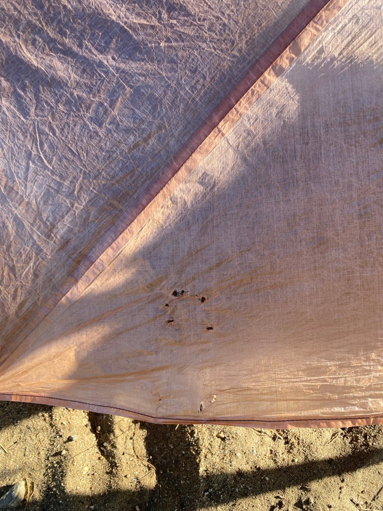 In the morning I still felt on edge; I was sure I hadn’t imagined the sensation. I looked down at my foot and thought I saw a series of holes in the tent by my feet. I put my glasses on for a better look. Sure enough, there were bite marks in the tent wall and mesh liner in the distinct shape of a Canids snout. I hadn’t imagined it: a coyote nudged my leg as I slept.