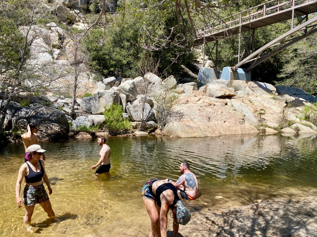 At Deep Creek Bridge we headed down to the stream for a quick dip. California was experiencing a heat wave and we were keen to cool off. On the sandy beach in the shade we had lunch before continuing on upwards and around the edge of the canyon. Moments later we celebrated reaching the 300 mile marker.