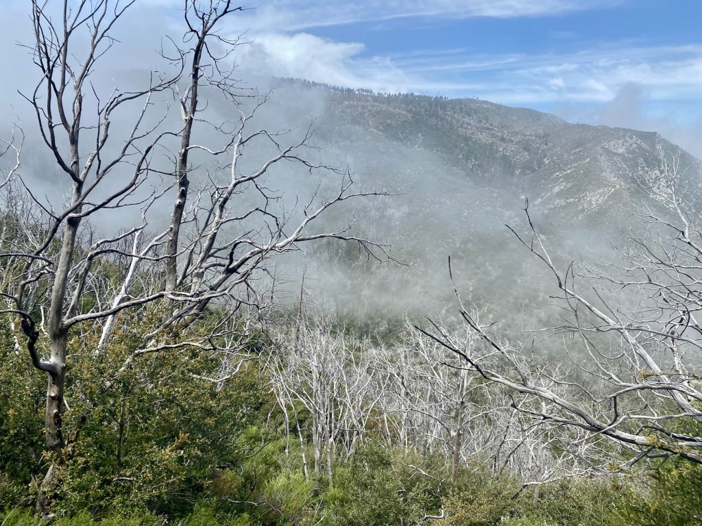 This day marked one whole month on trail. We moved out quickly, breaking camp and congregating around a picnic table to eat left over pizza and coffee before heading on out up the ridge. The area surrounding us had been heavily burned from past fires. The cloud eerily floated into the valley, swirling upwards. It felt akin to the smoke which caused the area to become blackened in the first place.